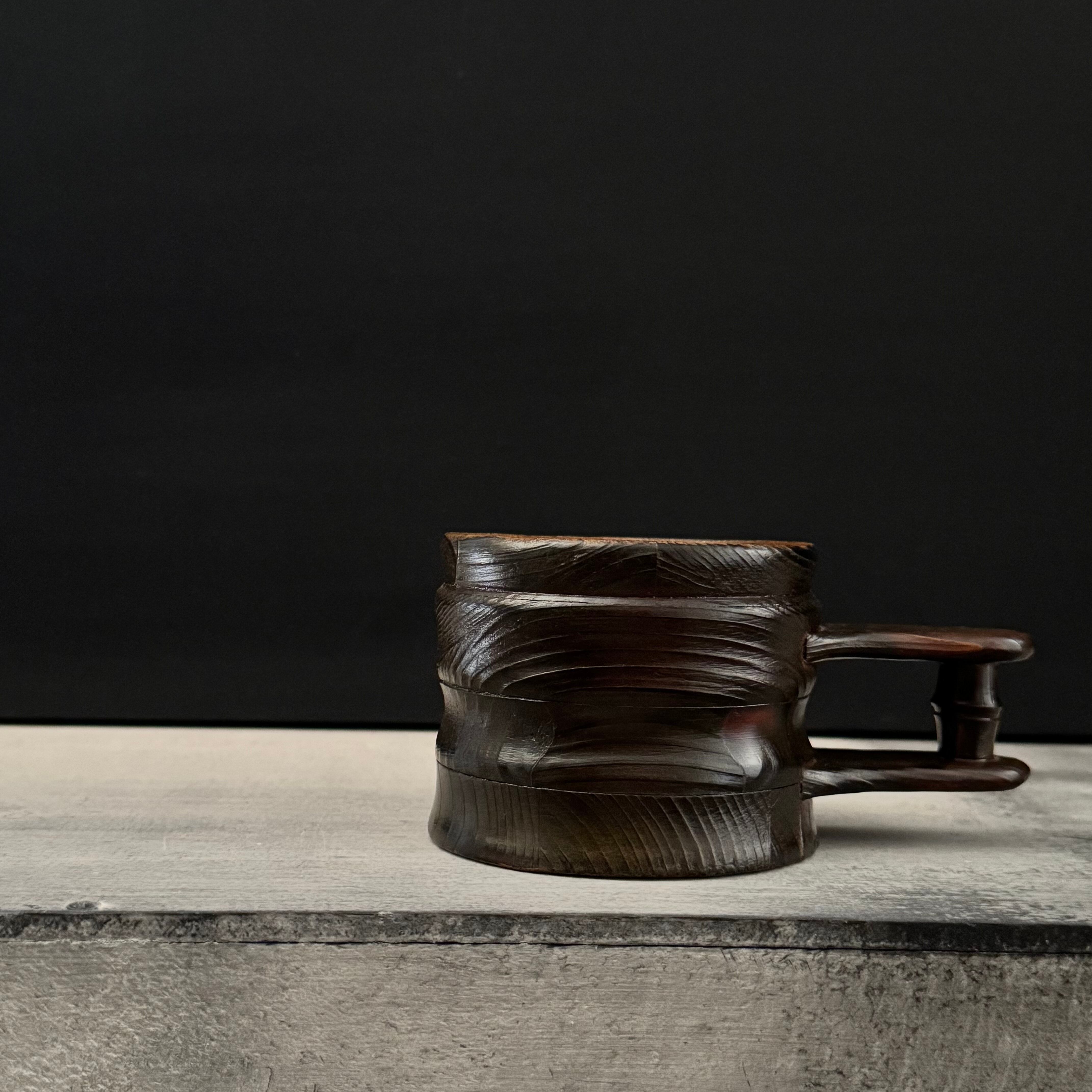 不揃いな間伐材を貼り合わせ、火で炙ることで生まれる、クラッキングや燃え朽ちたような形状変化。そして、漆との相性が良いコーヒー豆を使った蒔地で強度と深みを加えることで、陶磁器とはまた違った、自然が作り出す偶然の美しさを表現できたと考えています。