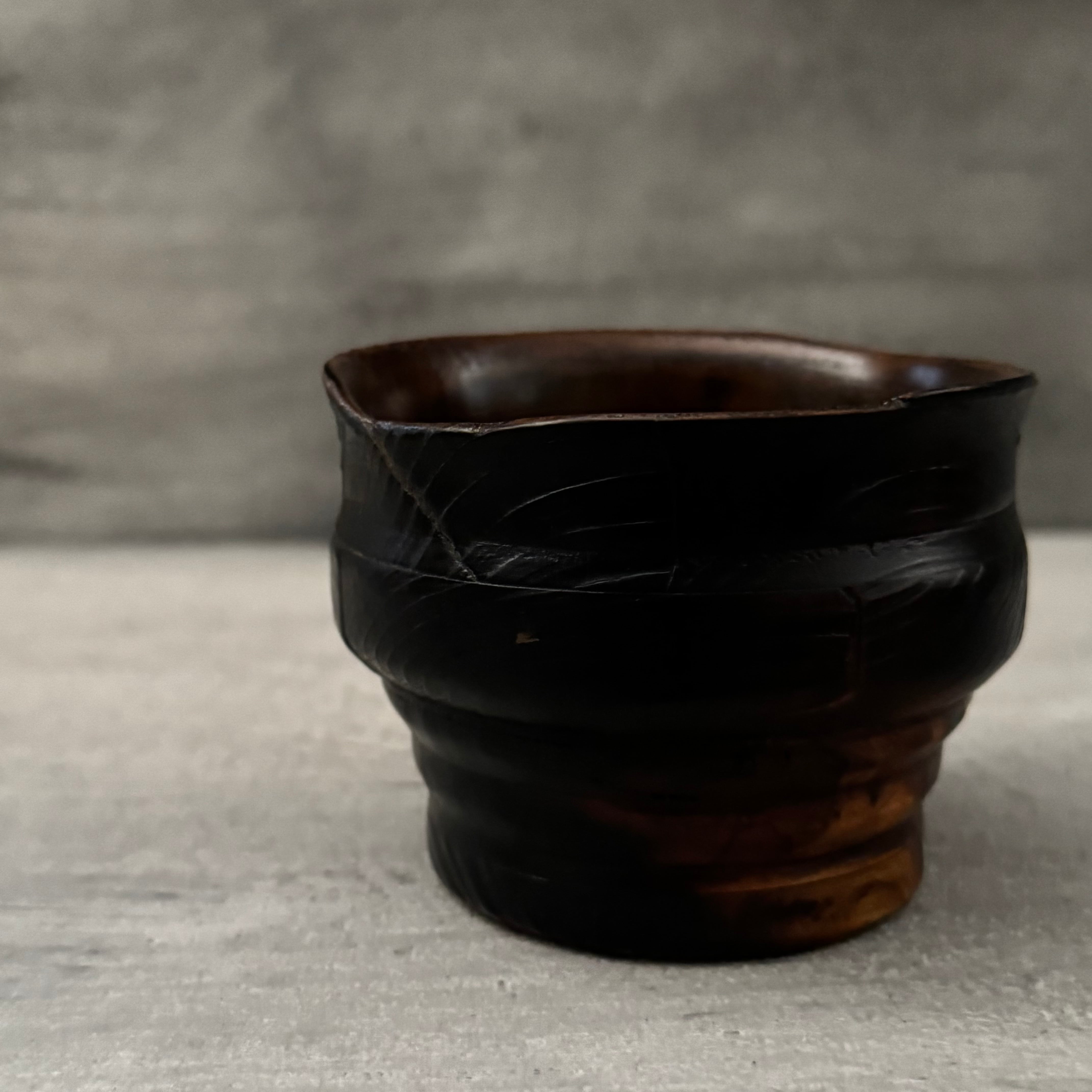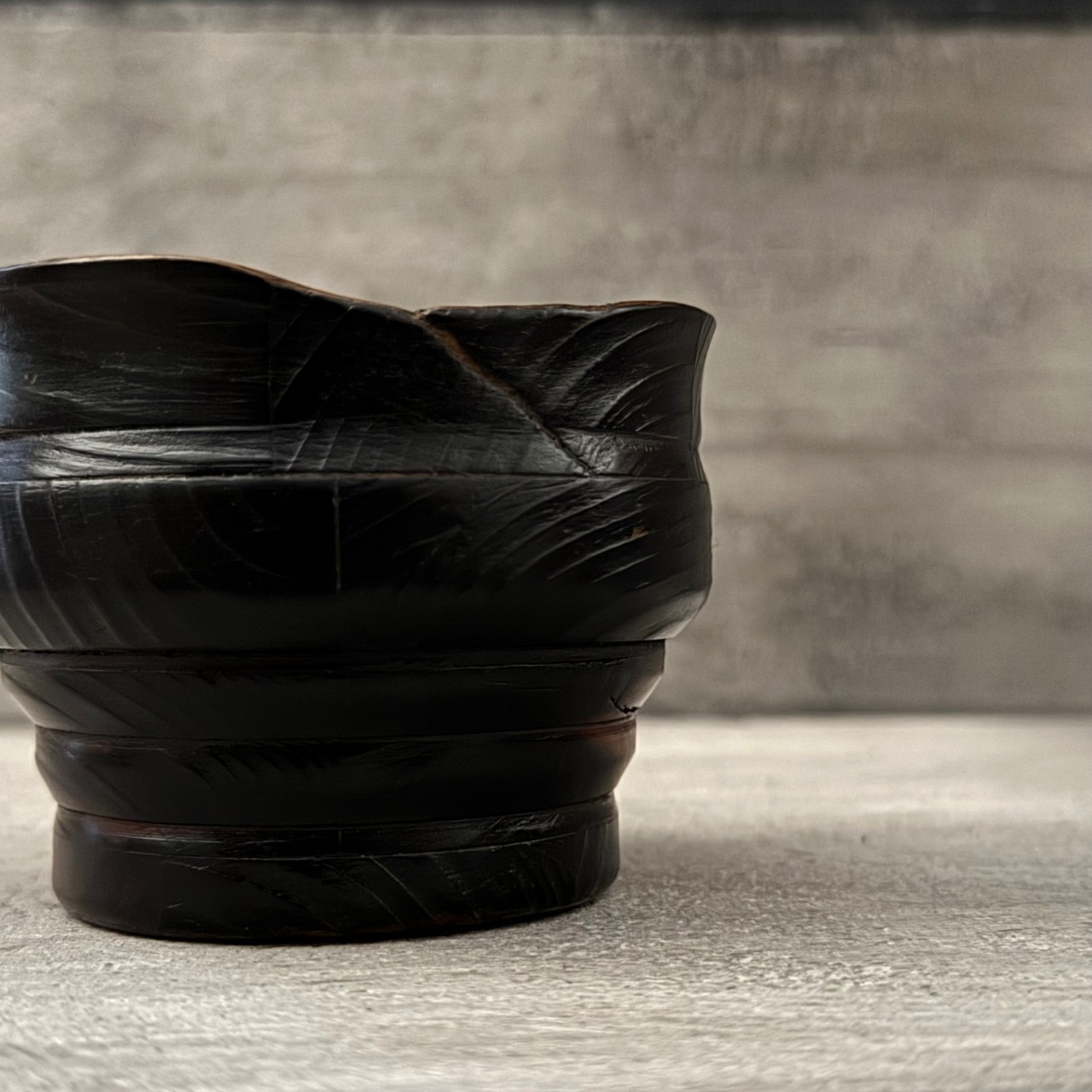 不揃いな間伐材を貼り合わせ、火で炙ることで生まれる、クラッキングや燃え朽ちたような形状変化。そして、漆との相性が良いコーヒー豆を使った蒔地で強度と深みを加えることで、陶磁器とはまた違った、自然が作り出す偶然の美しさを表現できたと考えています。
