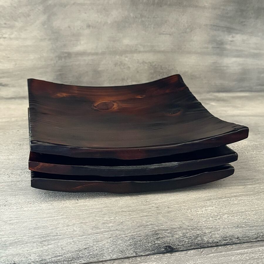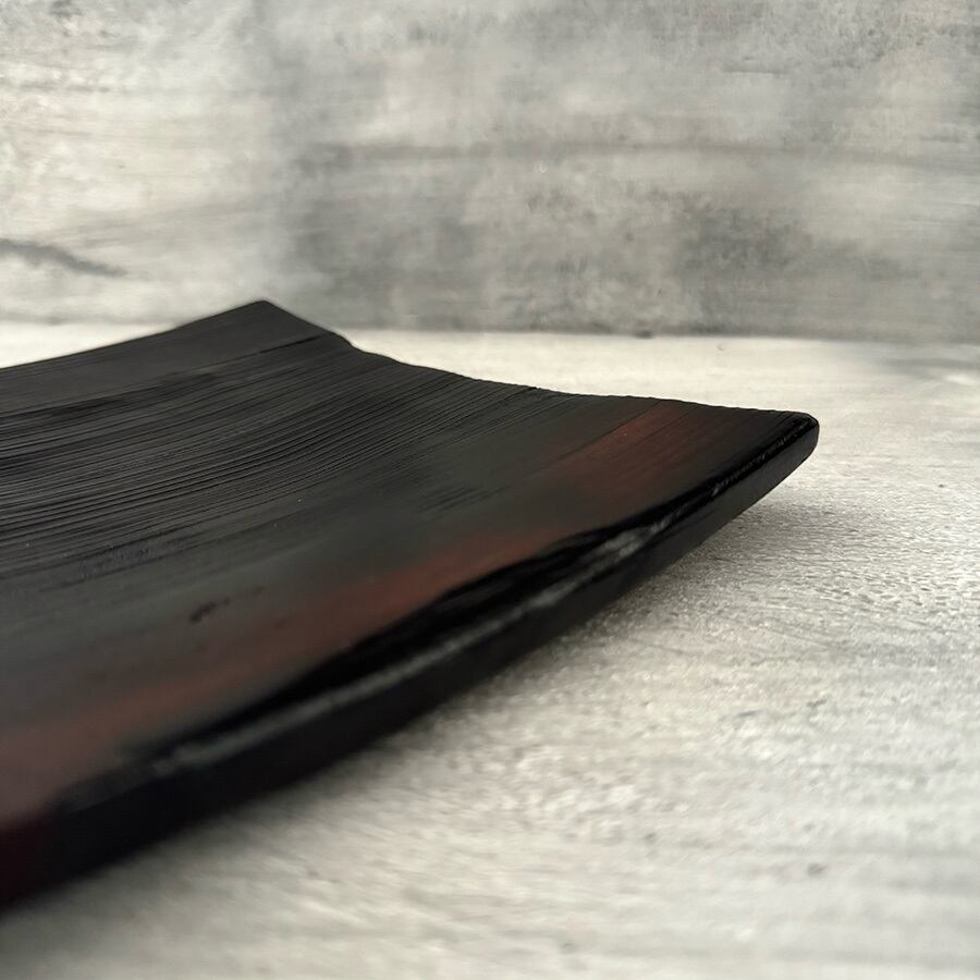 不揃いな間伐材を貼り合わせ、火で炙ることで生まれる、クラッキングや燃え朽ちたような形状変化。そして、漆との相性が良いコーヒー豆を使った蒔地で強度と深みを加えることで、陶磁器とはまた違った、自然が作り出す偶然の美しさを表現できたと考えています。