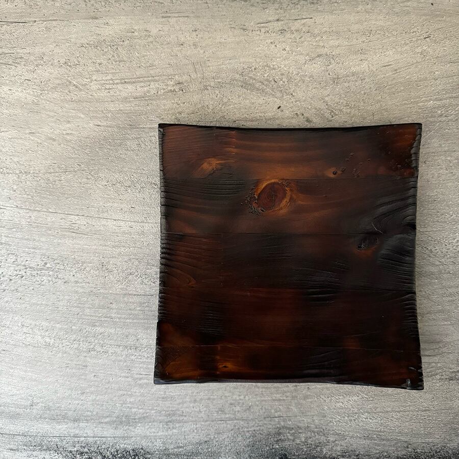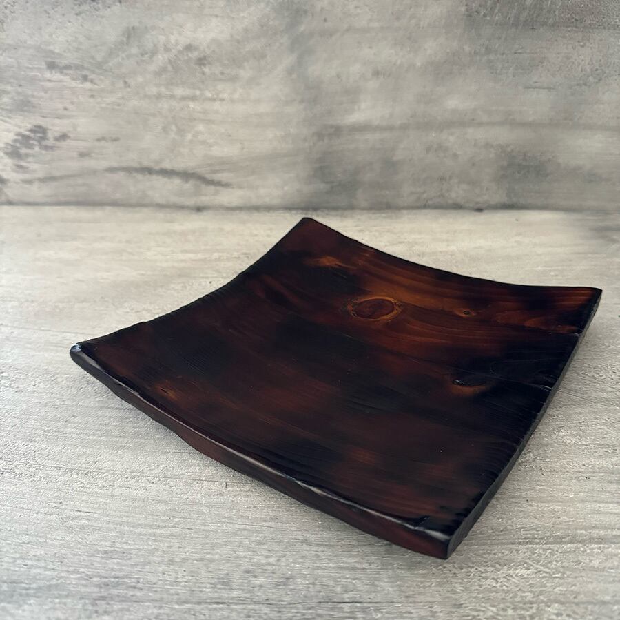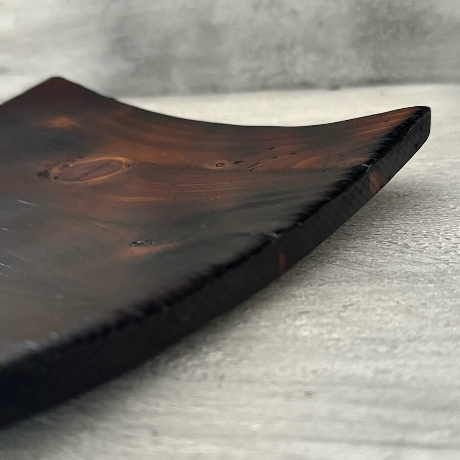 不揃いな間伐材を貼り合わせ、火で炙ることで生まれる、クラッキングや燃え朽ちたような形状変化。そして、漆との相性が良いコーヒー豆を使った蒔地で強度と深みを加えることで、陶磁器とはまた違った、自然が作り出す偶然の美しさを表現できたと考えています。